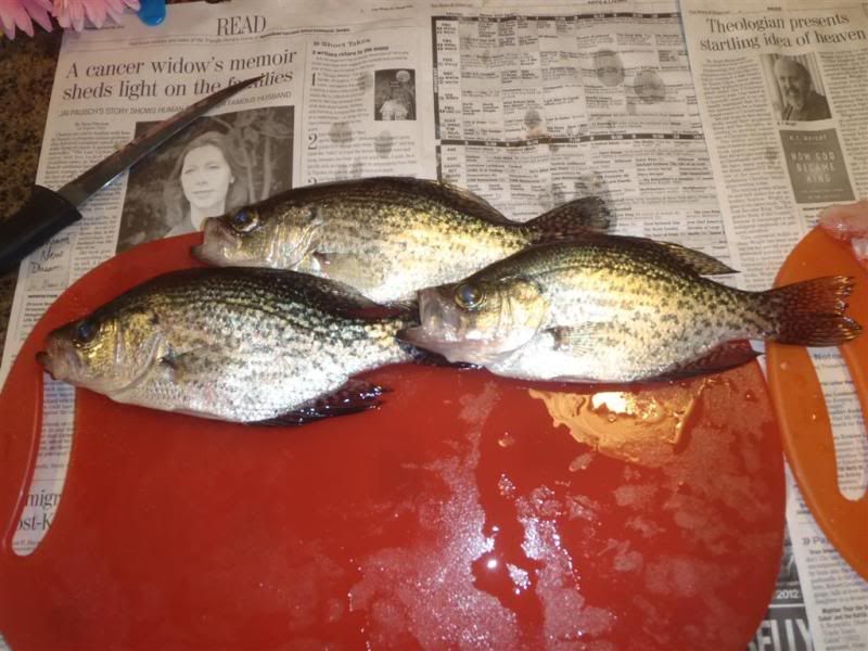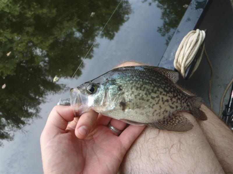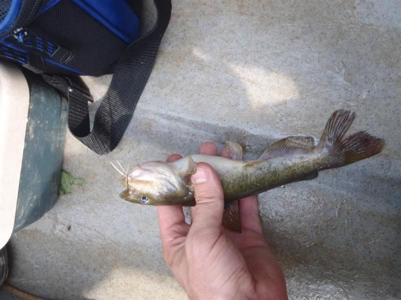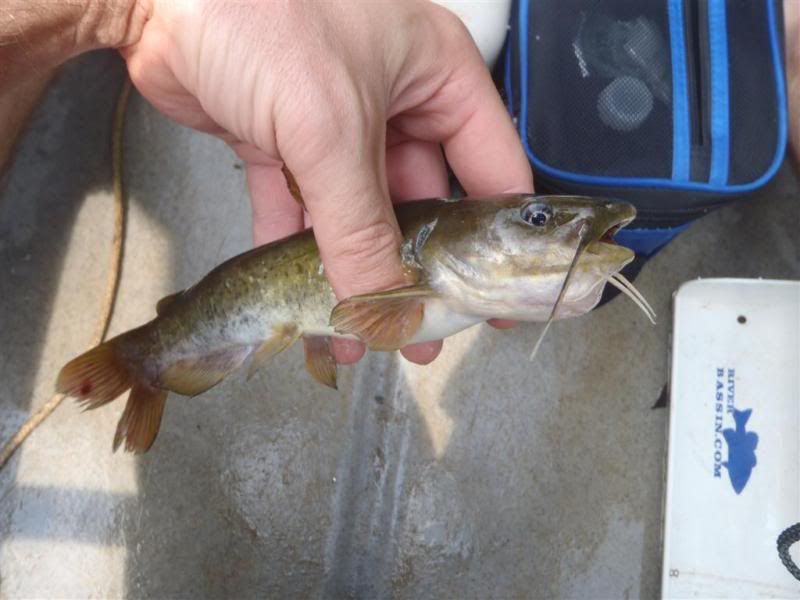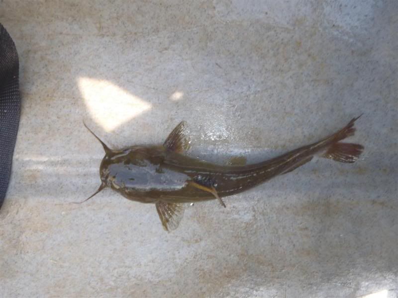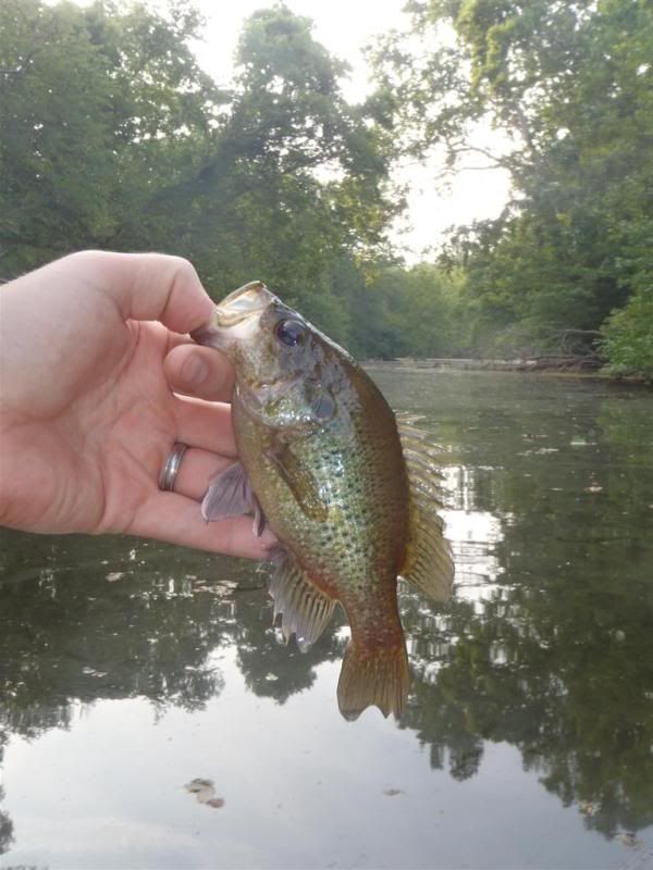 I managed to get out early today for a few hours and fish a small peidmont flow that usually does well for me in the spring and fall. The water was low and mostly stagnant. Caught a mixed bag: 5 bass, 2 pickerel, 1 warmouth, 1 catfish, ~8 crappie. Most fish came on a smoke colored fat albert grub or a bettle spin. The bass were tough to find. They didn't seem to be hanging under wood and most were caught off the bank near the channel. Got into the crappie on one laydown and finally had the sense to use my lunch cooler for the fish. Brought home 3 decent sized fish. I can't easily ID the catfish, channel cat? Any guesses?